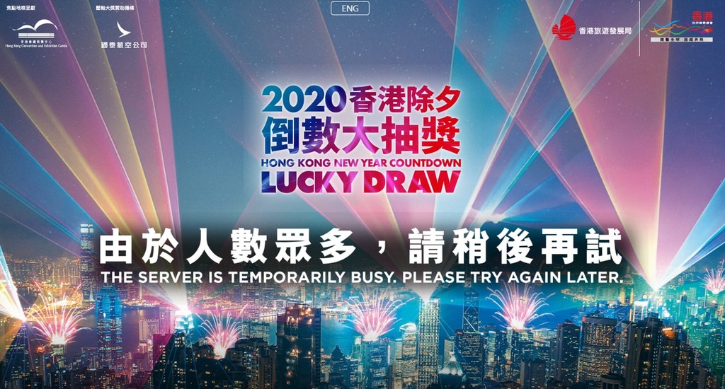 香港維多利亞港跨年煙火今年取消,改舉行「加強版」幻彩詠香江配合大廈煙火倒數,並首次舉行「倒數大抽獎」活動,最大獎為4張來回香港與任何地點的機票。不過,原本大受期待的「大抽獎」卻連連出包,一下收不到驗證碼、一下無法進入活動網頁,引來大批民眾不滿,主辦的旅遊發展局只好將抽獎延至元旦晚間。