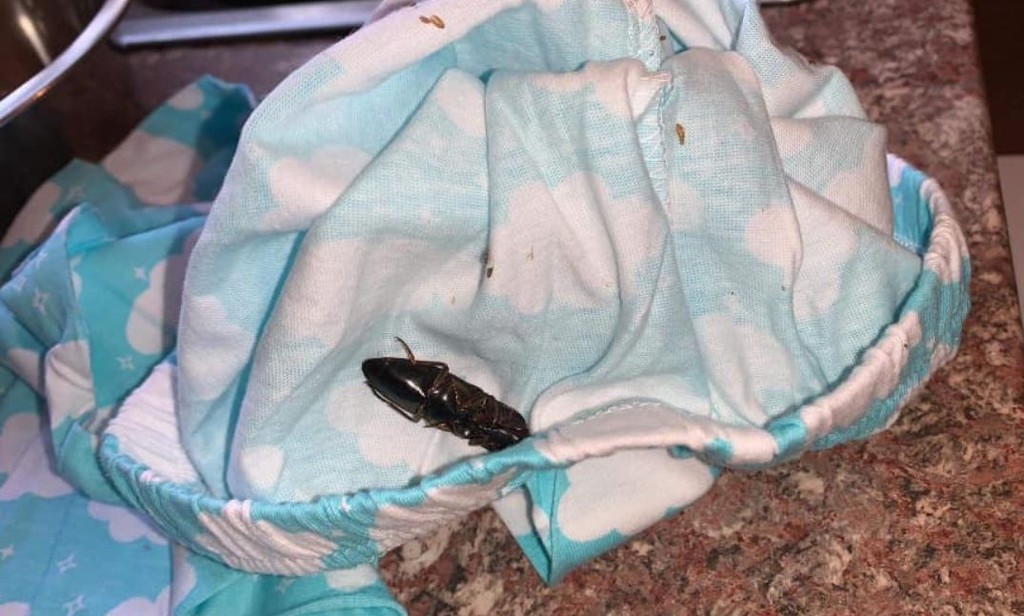 ▲羅伊拆開睡衣的當下,被眼前的蟑螂屍體嚇傻。(圖/翻攝自Karla Styliee Roy臉書)
