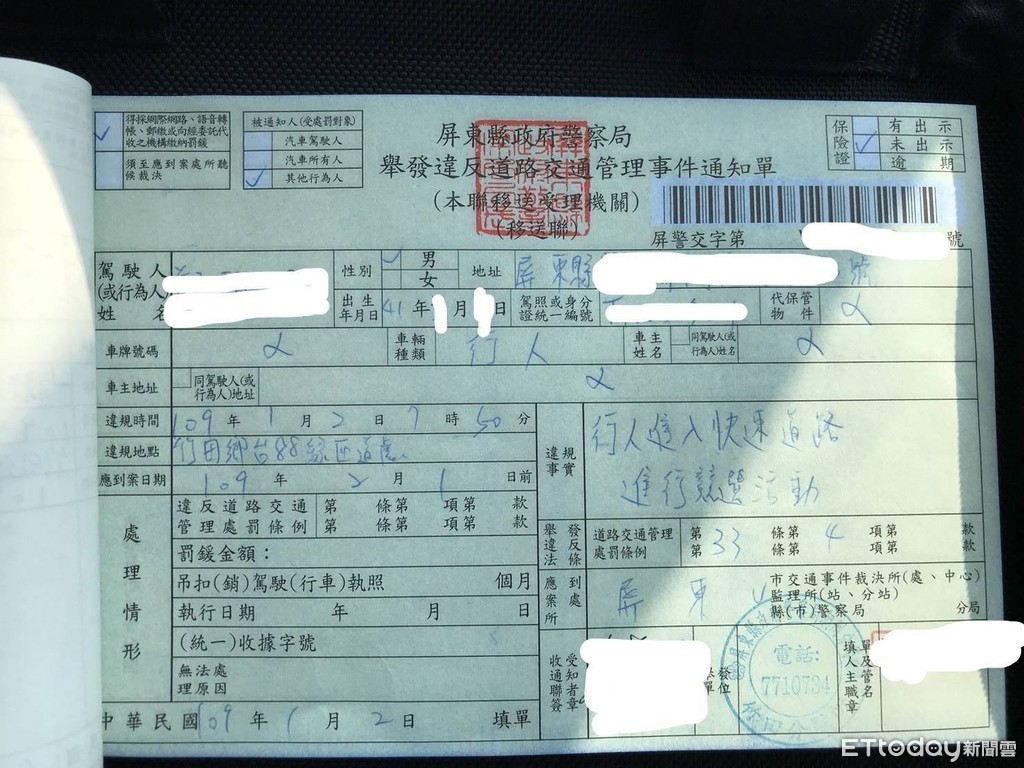 由於當時是清晨,潮州地區起濃霧,能見度不佳,當時正處於上班交通巔峰時刻,車流量較大,險象環生,員警獲報旋即到場勸導,復依違反道路交通管理處罰條例第33條第4項製單告發。