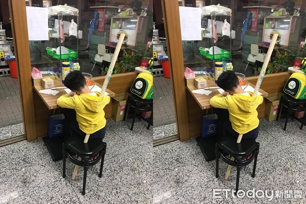 老爸張煜欣在「爆廢公社二館」發文打趣道,「虎媽說沒寫完功課,屁股不能離開椅子,於是使出定海神針這招大絕。」只見一根超長木棍穿過弟弟的帽T及板凳圓孔,瞬間固定住他,而弟弟也專注地完成作業。