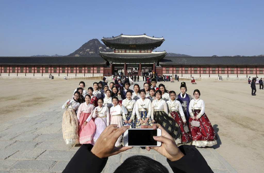 ▲一群穿著傳統韓服的年輕人,在首爾景福 門前合照留念。一項調查結果顯示,逾半數「Z世代」的韓國人都不想結婚、也不想生孩子。(圖/達志影像/美聯社)