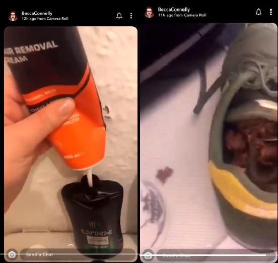 隨後貝卡又拿起男友「最寶貝的衣服」,並用剪刀各種亂剪,還特別挖出一件褲子並用力的把下面褲檔的部分,剪出一個大洞;再拿出漂白水於衣服上「作畫」,目的就是想讓這個渣男看到能夠崩潰!影片到這裡還沒結束,後頭貝卡又在男友的拳擊手套上挖洞,然後倒入不知名的黏稠液體,最後更把巧克力融化成液狀,倒入男友的鞋子裡。