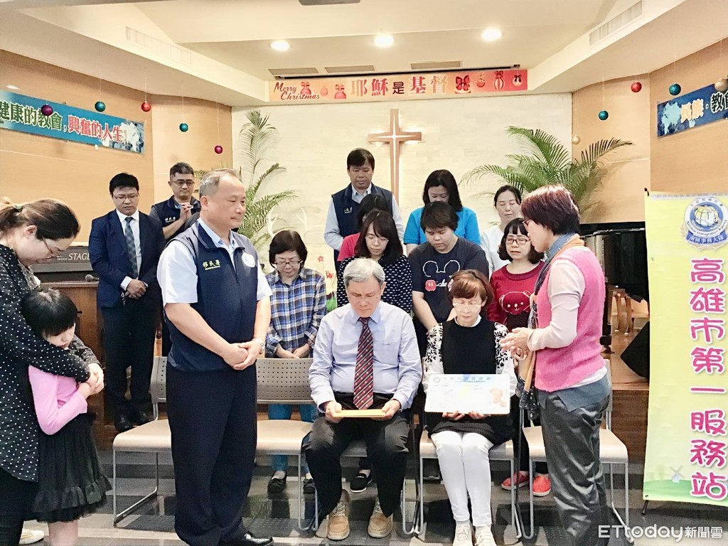 ▲▼移民署高雄市第一服務站到一心教會、徐志權主任(左一)頒給金基文牧師永久居留權。