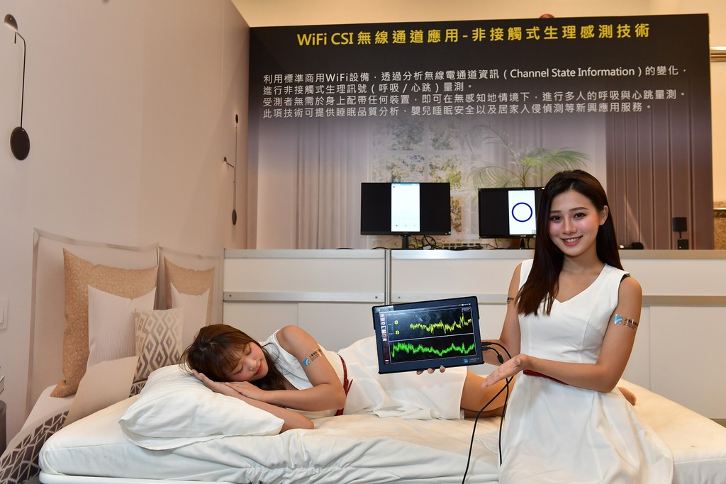 工研院提出一套在睡眠期間減緩呼吸中止的技術,透過低功率的WiFi設備,使用者躺在床上無需配帶任何接觸式/穿戴式裝置,並將充氣墊放置於枕頭下方,在偵測到睡眠者停止呼吸時,床下的呼吸偵測裝置會對枕下充氣墊充氣,讓頭部輕微移動解決呼吸道阻塞恢復呼吸,並已通過人體六大睡眠姿勢的檢測,呼吸正確率達99%,目前正與國內知名睡眠中心合作。