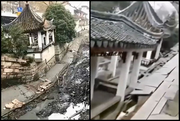 ▼十全街旁的涼亭也跟著下沉。(圖/翻攝自微博,下同)