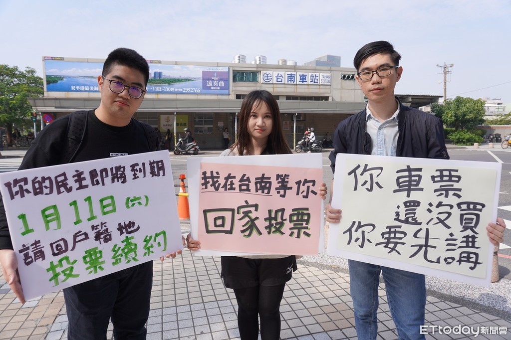 台南火車站人來人往,幾位大學生手舉「我在台南等你,回家投票」、「你的民主即將到期,請在1月11日回到戶籍地投票續約」、「你車票還沒買你要先講!」等創意標語,吸引路人目光。