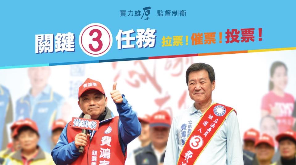 2020大選倒數5天,國民黨超級助選大將、新北漢子侯友宜市長6日下午特別跨界助選在地方上受到選民肯定的國民黨立委費鴻泰。侯友宜熱情地向民眾推薦,最專業問政,用心服務的③號費鴻泰,懇請鄉親堅定支持他「拉票、催票、投票」。