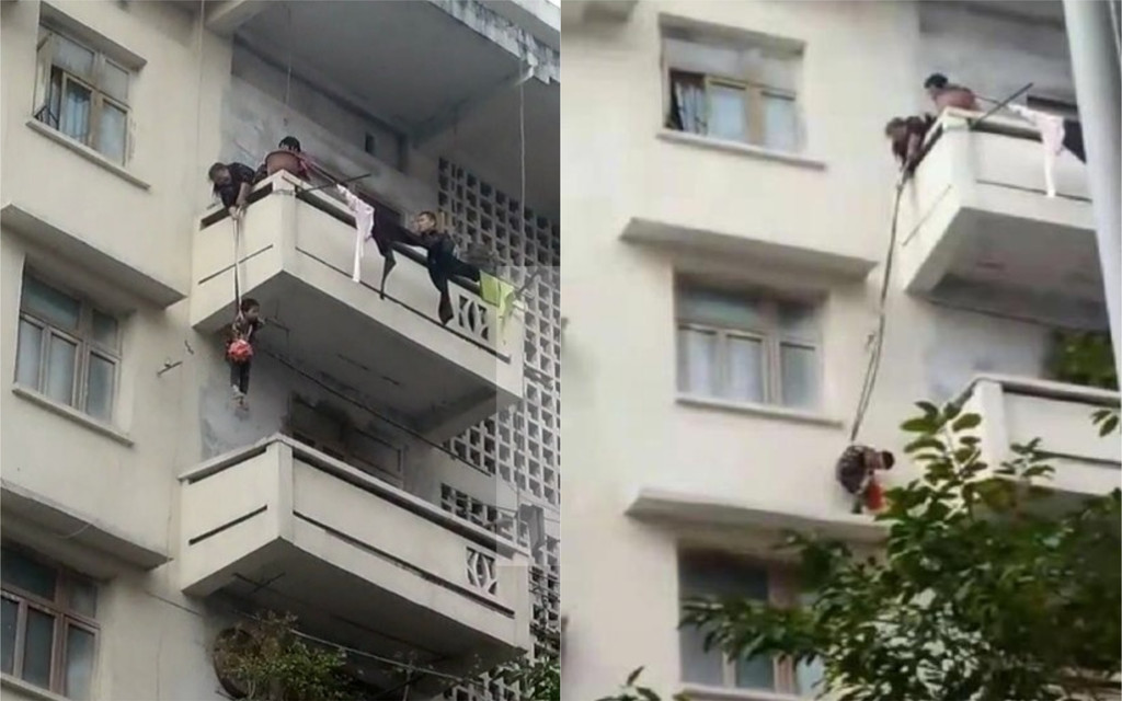 據《新京報》報導,四川南充市蓬安縣一名老奶奶於5日下午,在百貨公司宿舍附近,用一根繩子綁住年僅7歲的孫子的腰,再將其垂降至4樓拯救自己的愛貓。從影片中可以看到,當時男童被繩子綁住,站在陽台邊緣,驚險地將貓咪抓起後放入袋中,隨後才搖搖晃晃地被奶奶拉回5樓。