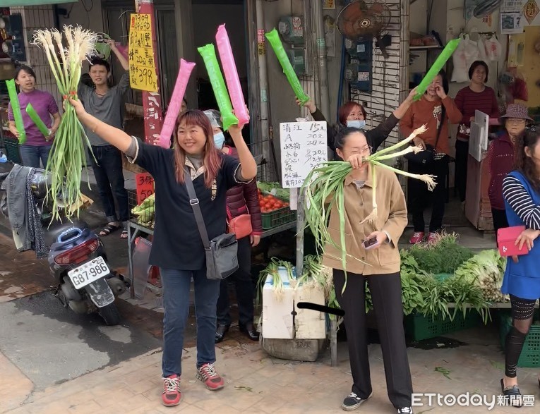 記者會後,小英車隊從嘉義出發。沿途支持者站在街口,手上拿著支持旗幟及標語揮舞,還有支持者自製手板,市場裡買菜買到一半的民眾,手上高舉一把「蔥」為小英加油打氣,祝福順利「凍蒜」。