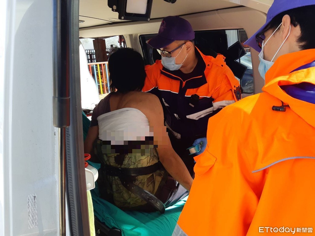 ▲林男背部遭斷裂割草機刀片割破20公分長傷口。(圖/大溪警分局提供)