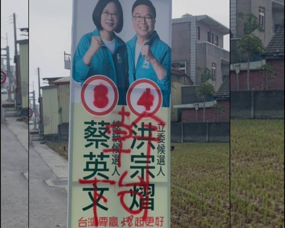彰化民進黨4席立委候選人,陳秀寶、黃秀芳、洪宗熠與陳素月,在大街小巷幾乎可以看到與總統蔡英文同框的安定護台灣的長型旗幟看板,7日上午洪宗熠的選區有目前超過不同地點三處、三張看板皆遭到用紅筆或紅漆塗抹,有用紅漆寫下「幹!下台」、也有將名字塗抹掉。