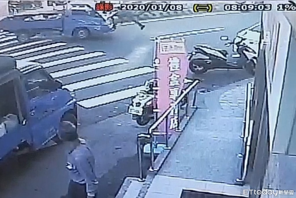 ▲▼張姓消防員走斑馬線過馬路,左方突然衝出貨車將他撞飛倒地。(圖/民眾提供)