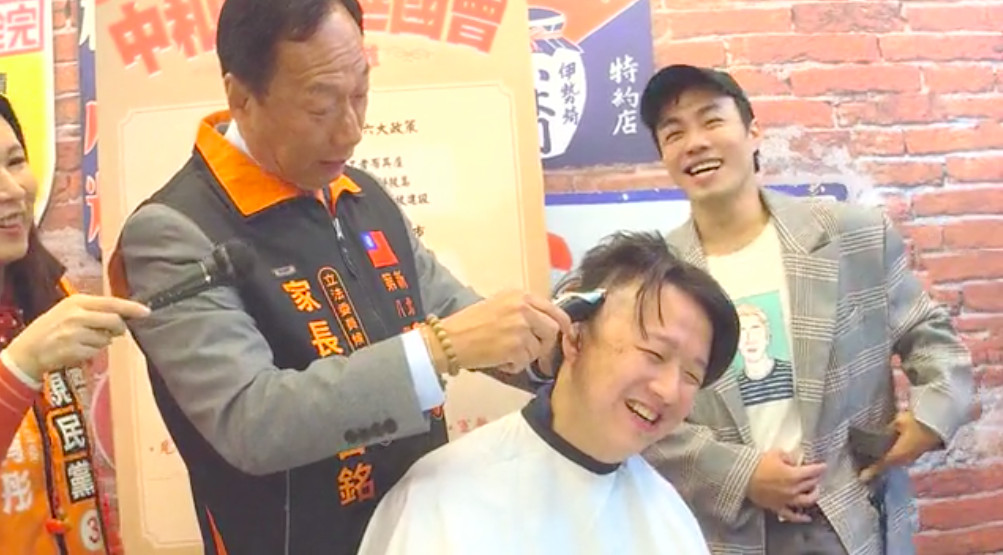 鴻海集團創辦人郭台銘9日手拿著電動剃刀為「郭家軍」親民黨新北市第8選區立委候選人李正皓剃頭,這也是他第一次幫別人「剪頭髮」,郭台銘表示,他以家長的身份剃頭,當兵時也以剃頭宣示效忠,以剃頭儀式代表李正皓效忠國家的決心,郭台銘最後還在李正皓背上寫下「精忠報國 不能貪汙」,吸引2千人觀看直播。