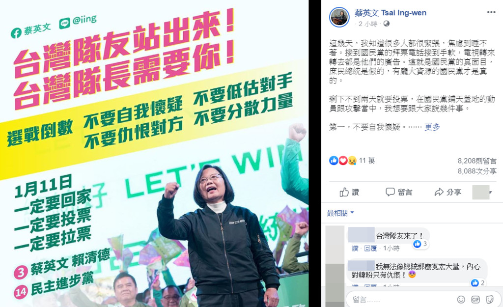 總統蔡英文9日在臉書向支持者喊話,「這幾天,我知道很多人都很緊張」,焦慮到睡不著,接到國民黨的拜票電話接到手軟,電視轉來轉去都是國民黨的廣告,這就是國民黨的真面目,庶民總統是假的,有龐大資源的國民黨才是真的,剩下不到兩天就要投票,在國民黨鋪天蓋地的動員跟攻擊當中,她想要跟大家說「4個不要」。貼文出爐短短2個小時,就有11萬個讚、8088次分享,湧入8208次留言。