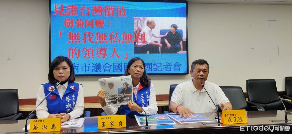 台南市議會國民黨團,不滿「樹菊阿嬤」一席與韓國瑜的知性談話,卻被民進黨1450狂「黑」,10日站出來公開挺樹菊阿嬤,黨團發言人王家貞、盧崑福、第五選區立委候選人蔡淑惠議員召開『見證台灣價值,樹菊阿嬤:「無我無私無利的領導人」』記者會。