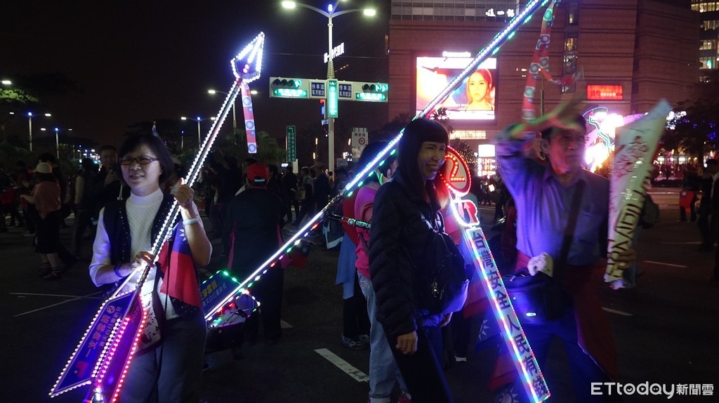 ▲國民黨夢時代選前之夜,散場時韓粉排隊與LED巨型穿雲箭合照。(圖/記者吳奕靖攝)