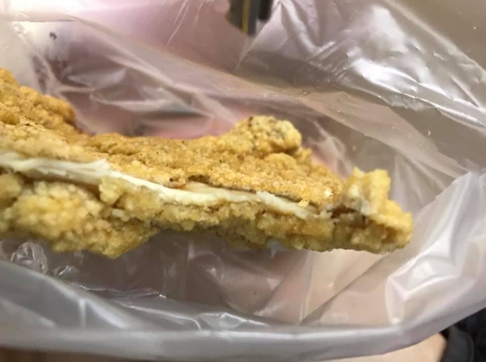 照片曝光網友全笑說,「這是吃炸粉吧」、「炸粉附贈薄肉片」、「這應該用沖床壓扁的,有開雞排模具」、「老闆賣的不是雞排,賣的是刀功」、「這只有0.2公分吧」、「有一部分賣雞排的都是拿專用的鐵鎚把肉打的很薄,然後粉裹的厚厚的,看起來很大塊。」