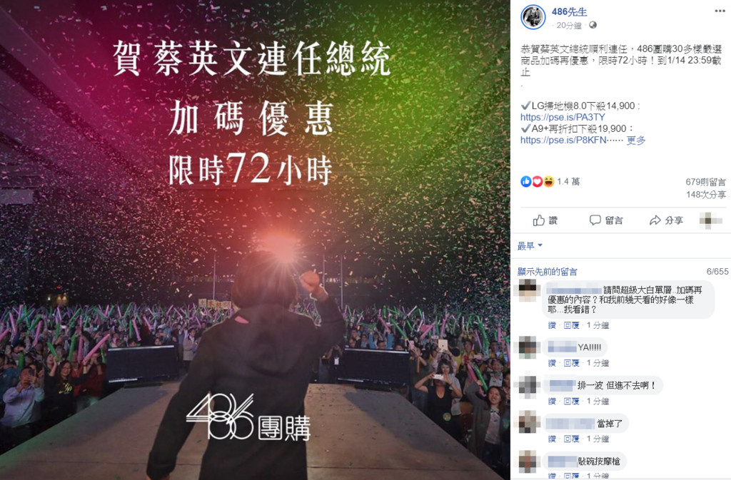 知名團購達人「486先生」陳延昶11日晚間慶祝總統蔡英文連任,宣布30多項熱門商品加碼打折,優惠限時72小時,直到14日23點59分為止。不料消息一出,網站立刻被塞爆,還出現大當機,引發網友討論。