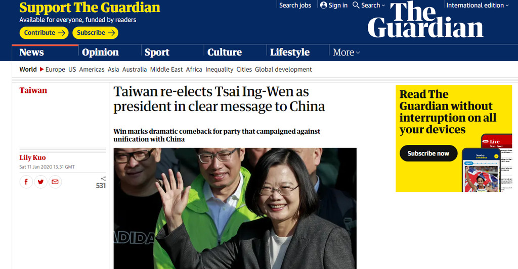 總統蔡英文以超過800萬票成功連任,英國《衛報》指出,台灣選民選擇了一位在競選期間承諾,會保護台灣不受北京政府影響的領導人。並引述蔡英文勝選演說,表示這次的選舉具有額外的意義,「台灣已經表明,當我們的主權和民主受到威脅時,台灣人會更大聲地回應我們的決心。」