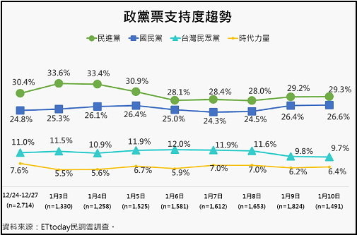 另外,ETtoday民調中心在2019 年12月24日~27日所進行的封關前民調,當時統計出民進黨政黨票得票率為30.4%,國民黨24.8%,台灣民眾黨11.0%,時代力量7.6%,親民黨3.0%;推估民進黨能取得14-16 席,國民黨10-12 席,台灣民眾黨4-6 席,時代力量2-4席,親民黨0席。