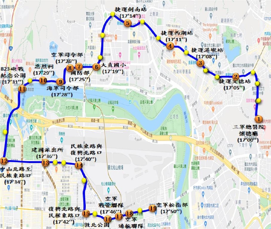 至於沿途致敬點方面,從松指部、敦化北路及南京東路口等11處(22點)致敬點致敬點,沿路採單邊列隊,提供國軍官兵及國人緬懷殉職將士,各致敬點同樣設有專人引導,民眾可攜帶小國旗共同參與。