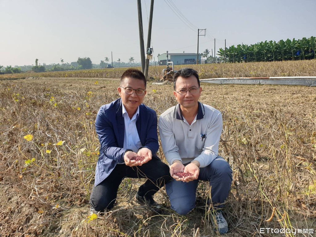 ▲屏東縣萬丹鄉「老鷹紅豆」團隊執行李建輝和農糧署南區分署長姚志旺(左)手捧生產老鷹紅豆 。(圖/記者陳崑福翻攝)
