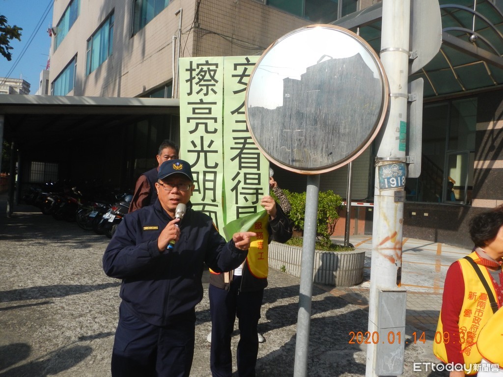 ▲台南市警白河、新營、第四分局等,出動員警及志工,在轄區擦亮反射鏡,提高路口視線死角預警效果。(圖/記者林悅翻攝,下同)