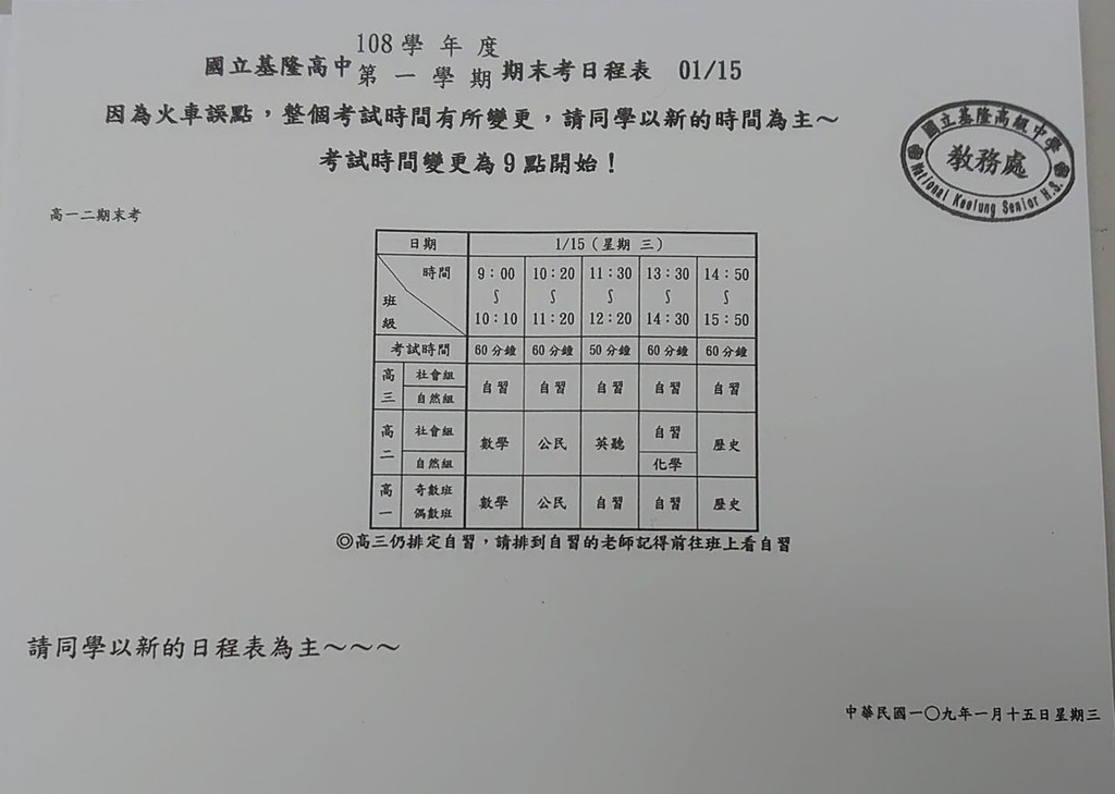 ▲火車延誤,基隆高中宣布期末考延後1小時。(圖/翻攝自Facebook/國立基隆高中,下同)