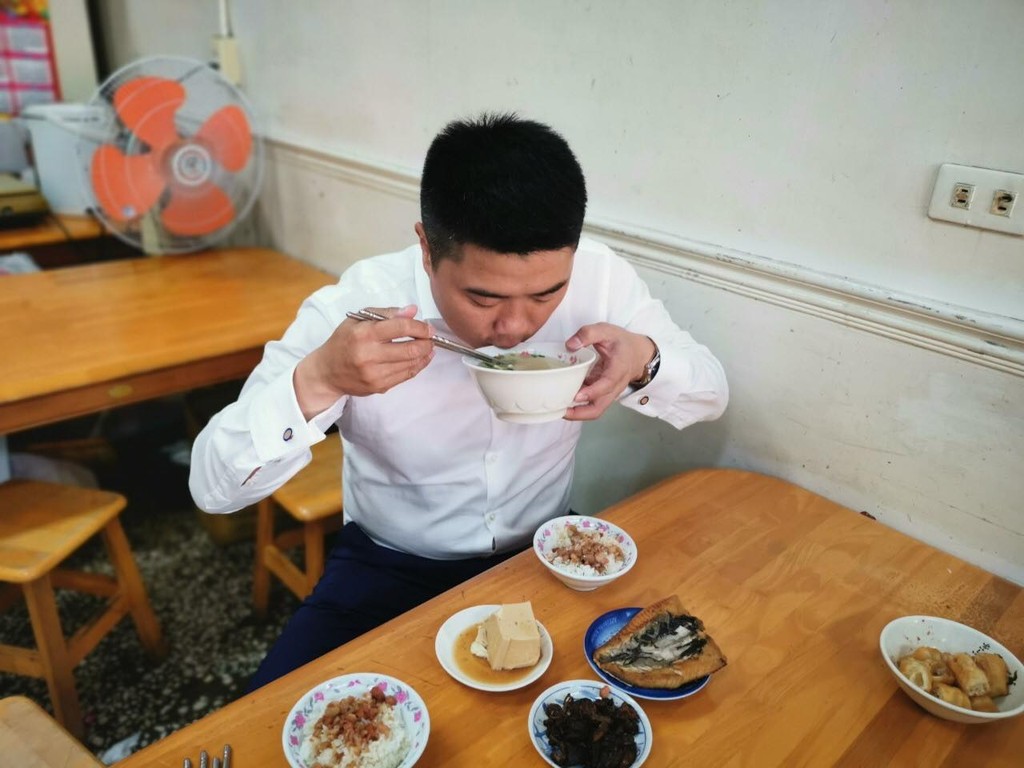 ▲顏寬恒吃魯肉飯配乾煎虱目魚,「吃飽才有力氣工作」。(圖/顏寬恒臉書提供,下同)