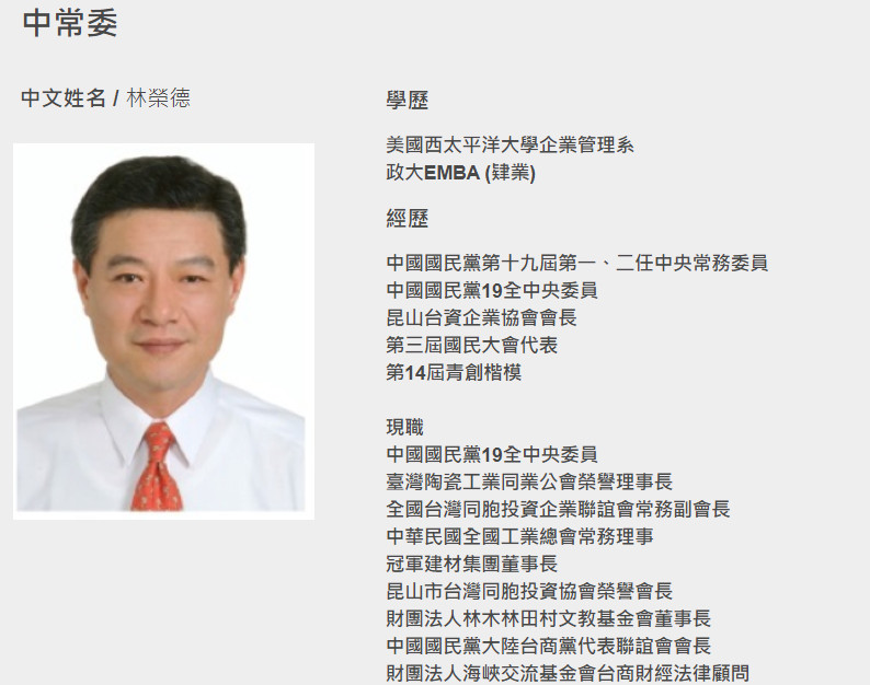 國民黨中常會15日決議由不分區立委曾銘宗擔任秘書長,至於吳敦義請辭後黨主席的遺缺,經中常委「互推」後決議由林榮德代理。林榮德的背景引發外界好奇,根據國民黨官網資料顯示,其大陸投資經歷相當豐富。