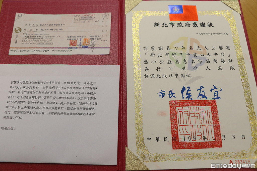 新北市長侯友宜15日主持市政會議特別感謝一位默默做公益的善心人士,近10年來每到農曆春節前,都會以「無名氏」名義捐贈善款,2020年再度捐贈2000萬善款。侯友宜表示,將妥善規劃這筆善款在社會福利政策上,希望各界持續響應「好日子愛心大平台」,嘉惠更多社會弱勢。