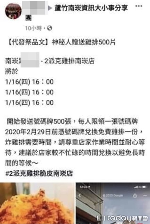 最近在臉書《蘆竹南崁資訊大小事分享》有網友代發祭品文:神秘人贈送雞排500份,地點則在蘆竹區南崁路上的雞排連鎖店,時間是16日下午4時,現場發放500張號碼牌,每人限領一張,發完為止,今年2月29日前可憑號碼牌免費兌換雞排一份,還建議在店家不忙碌時間領取,結果下午2時不到就有民眾在雞排店前排隊領取號碼牌。