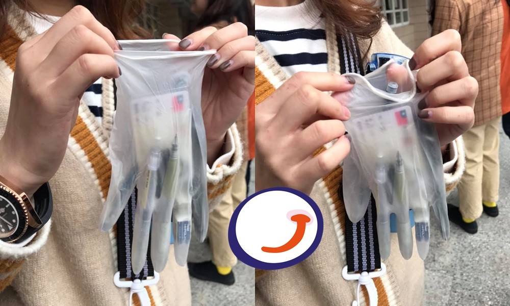「今天大學學測,依考場規定必須攜帶透明筆袋,於是我的女兒的筆袋……」,這位媽媽在文中貼出2張照片,只見女兒手拿透明PVC無塵薄手套,裡面則裝著身分證、2隻筆、橡皮擦等文具用品,而且每一格手指都剛好可以放一樣東西,「怎麼有這麼天才的小孩啊!她說塑膠袋會有聲音、筆袋有拉鍊聲、手套是最好的選擇。」