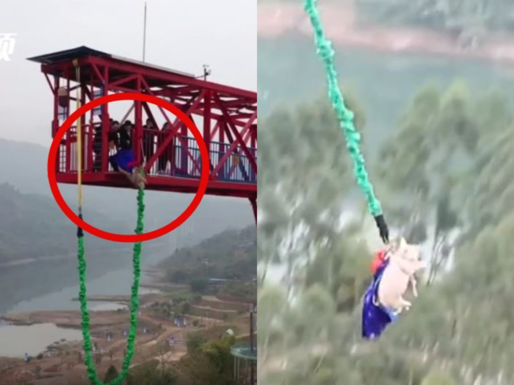 重慶紅酒小鎮景區18日為慶祝高空彈跳項目開業,將一頭100多公斤重的豬抬上高台,給牠穿戴好安全防護後,直接將其從68公尺推下去,隨後傳出豬的慘烈叫聲。工作人員稱是為迎接鼠年,所以舉辦了這個活動。影片po出後引發網民熱議,紛紛怒斥「這也太殘忍了吧!」