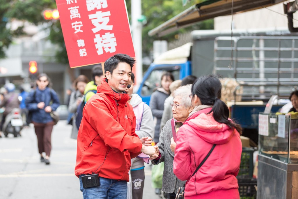 蔣萬安來到草埔市場向選民謝票,並祝福大家新年快樂,有熱情的支持者看到他相當開心,力拱參選黨主席、選總統,蔣萬安則謙虛的說謝謝,跟大家說「我會加油。」