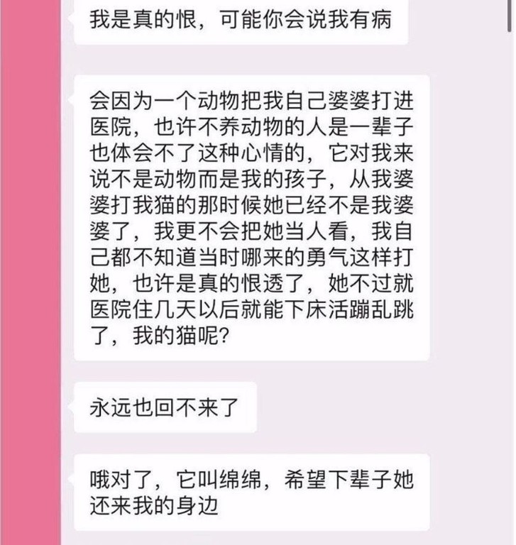 據《中國網》報導,婆婆因為不滿女子在家中飼養貓咪「綿綿」,怕影養未來孩子的健康,要求女子將養了2年的貓咪送走,即使女子解釋不會有影響,但婆婆依然堅持不可以讓貓咪待在家中。由於女子和貓咪有著多年的情感,從剛出生就抱回家養,多年下來已經將貓咪視為自己的小孩,沒辦法輕易割捨,於是拒絕了婆婆的要求。