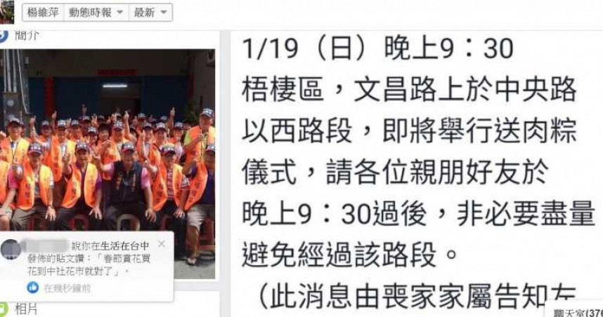 台中市梧棲區大庄里陳姓三兄弟,老大及老二2人於10年內去世,家屬為求平安,特別請來彰化地區的法師舉辦沿途「送肉粽」的習俗,並請附近民眾盡量迴避,由於許多民眾害怕這項習俗,大庄里里長楊維萍特別在臉書公告「送肉粽」的時間及路線,引發民眾關注。