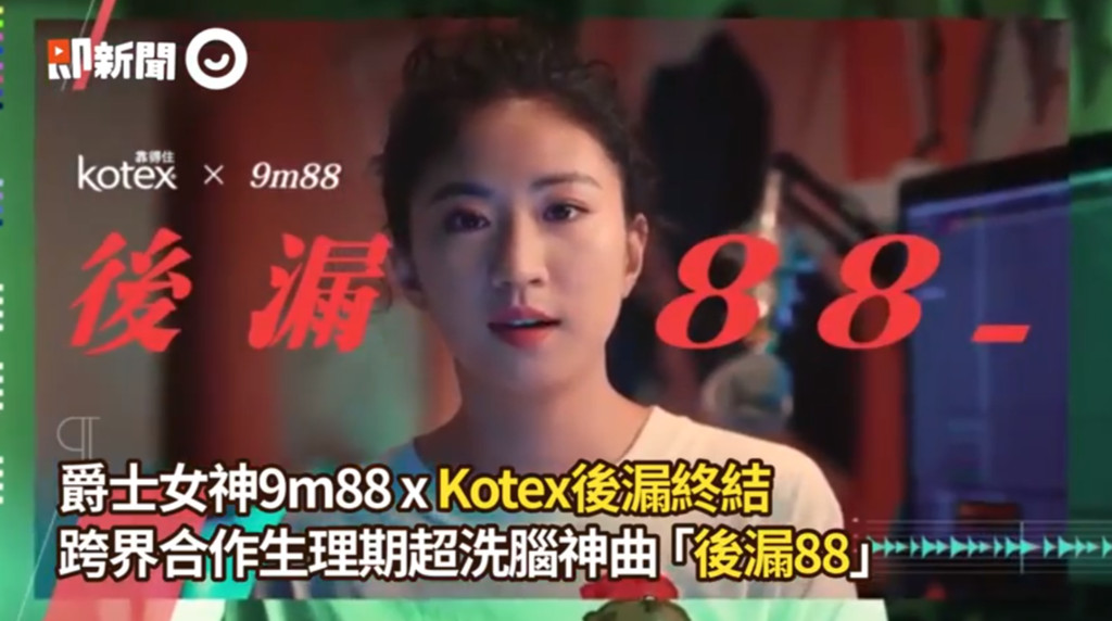 近期9m88與Kotex後漏終結合作獻唱「後漏88」廣告歌曲,獨特的嗓音搭9m88最擅長的靈魂藍調曲風,才公開在網路上,超chill的旋律很快就抓住眾人耳朵,不少看過廣告的網友還特地找到YouTube原曲留言:「從來沒看過衛生棉廣告這麼酷的,影片製作也很棒」、「廣告直接MV規格太猛了 88歌聲真的很美很吸引人」、「為什麼要逼我把衛生棉廣告加入like播放歌單」,就連男網友也愛上這首神曲,忍不住在留言區詢問「一個大男人一直看衛生棉廣告會不會很奇怪啊!?」