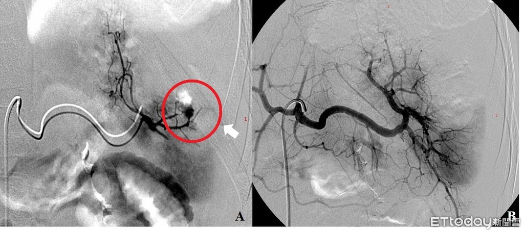 ▲男童送醫時,可明顯看出血點(左圖),經血管栓塞治療後已無明顯出血點。(圖/記者許宥孺翻攝)