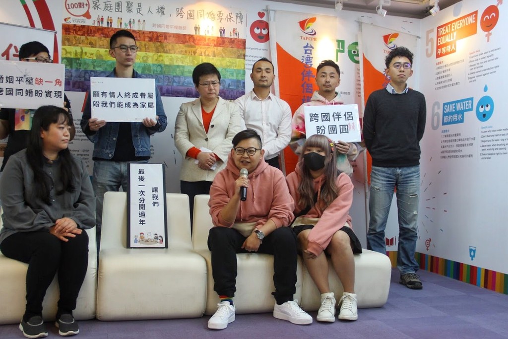 台灣伴侶權益推動聯盟(伴侶盟)與協同跨國同婚平權聯盟(跨同盟)在今(21)日召開「圍爐沒『伴』、成家無『法』——跨國同婚盼實現」記者會,期許連任的蔡總統與留任的蘇院長開放跨國同婚,現場多位尚未能結婚的跨國同志伴侶當事人出席,表達在過年期間無法團圓的辛酸與無奈。