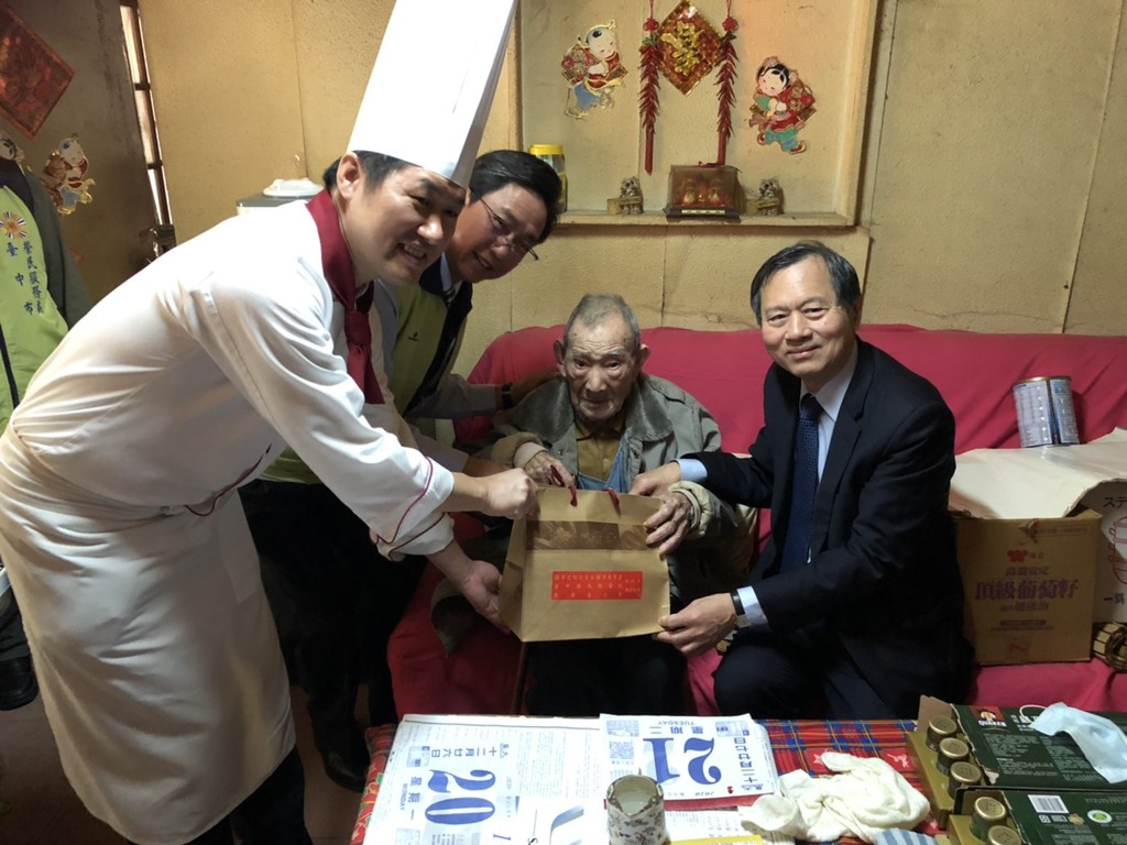 榮服處處長關永忠、中榮院長許惠恒和福華飯店主廚古傳福等人,帶著愛心年菜到成功嶺周遭的獨居老榮民家中,與獨居長者一起圍爐,讓長輩們也感受年節氛圍,不再孤單用餐,關永忠席間親切向榮民榮眷噓寒問暖話家常,也關心老伯伯年節期間的行程安排。