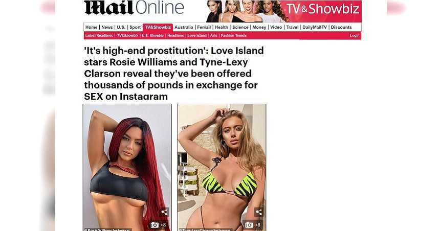 曾參加過約會實境秀《愛情島》(Love Island)的網紅泰恩萊克西(Tyne-Lexy Clarson)透露,19歲時首次接到飯局邀約,當時對方開價2萬英鎊(約台幣78萬)。而在出演《愛情島》第2季後,她接到經紀公司的電子郵件,有人以5萬英鎊(約台幣195萬)邀請她到杜拜住5個晚上,郵件內含保密協議。