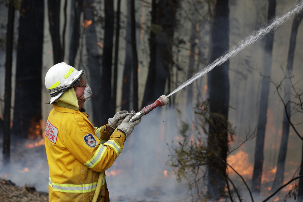 ▲澳洲新南威爾斯州一名消防員在火場灑水灌救。(圖/達志影像/美聯社)