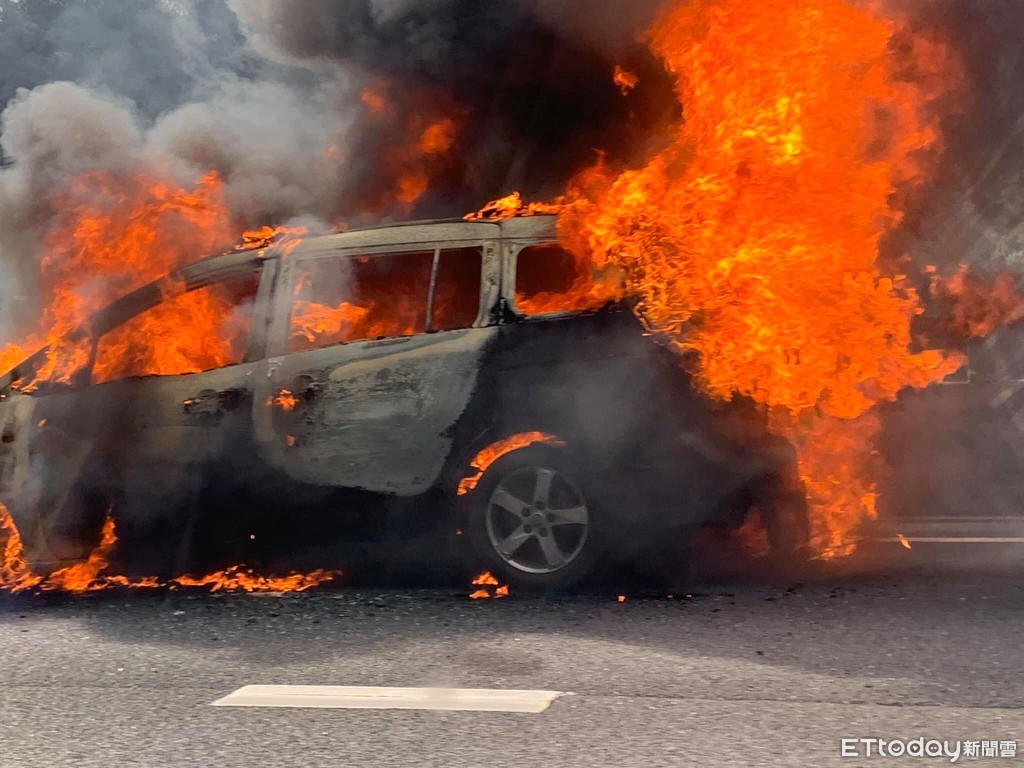 22歲李姓女性駕駛向警方表示,原本與好友們出遊,豈料車輛在行駛途中竄出濃濃白煙,她趕緊將車停於大客車專用道,車上4人一同下來察看,此時火舌突然竄出,迅速吞噬整台轎車,大家急忙退開。