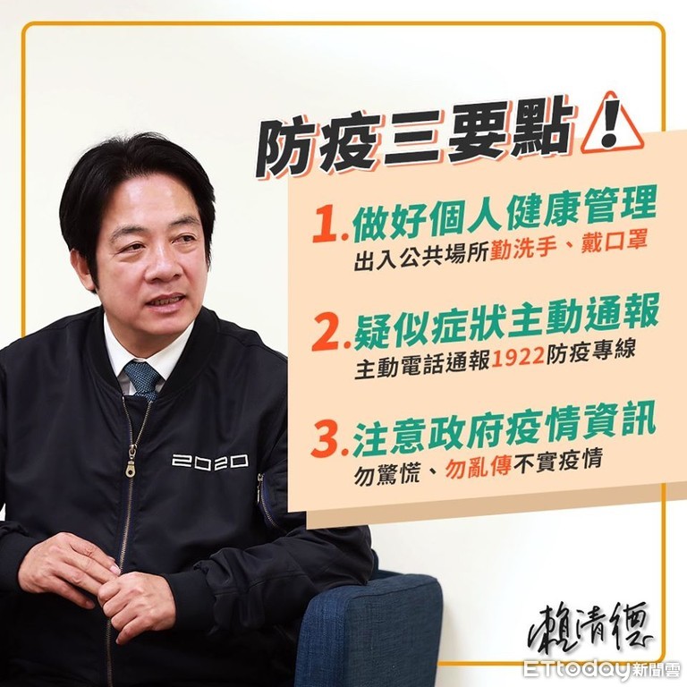 針對武漢肺炎疫情,準副總統賴清德23日透過臉書提醒國人3大防疫重點,強調防疫工作要做好,需要全民一起動起來。