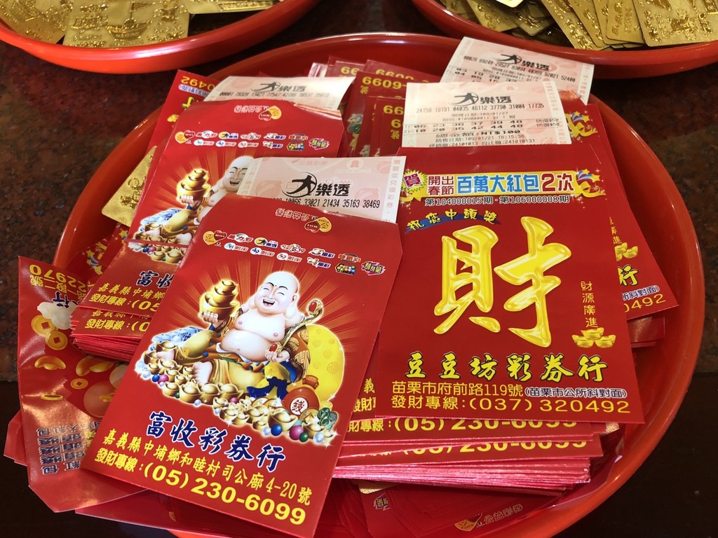 嘉義中埔鹽館財神廟廟方表示在濟公活佛、五路財神等神佛指示下,遠從中壢、苗栗和中埔購買了1000張大樂透彩券免費送,希望讓所有來廟信眾都能在金鼠年幸運發大財。