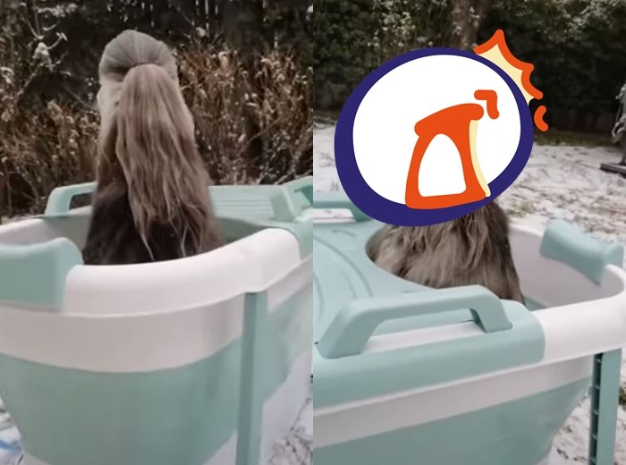 從影片中可以看到,在一片白皚皚的雪地中,一名正妹坐在桶子裡看著遠處風景,她一頭茂密的灰棕色長髮綁著公主頭,還有著微卷的線條,可以想像應是一位仙氣滿滿的正妹美女,讓人不禁急著敲碗正面。