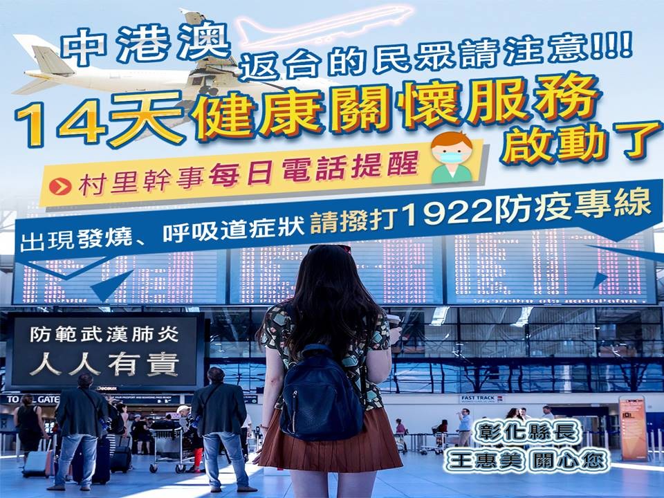 因應中國大陸部分地區進行封城以及疫情逐漸擴散,彰化縣目前配合中央防治策略彰化縣自即日起啟動「中港澳入境民眾健康關懷服務」。此項健康關懷服務目前先行以14天內曾到過武漢且於返台入境時未出現症狀之民眾為對象。由各鄉鎮市公所村里幹事協助配合執行,每日以電話關懷並填寫紀錄表,追蹤至入境後14天。追蹤過程發現異常狀況,將立刻回報1922,啟動協助就醫機制。