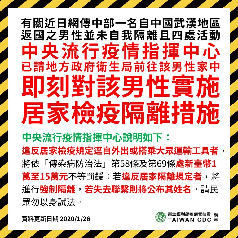 中央流行疫情指揮中心日已經宣布,所有自湖北省返台者都必須居家檢疫14天,不得外出。而針對台中該名個案,監測應變官、疾管署副署長莊人祥表示,今已經派衛生局人員至他家宣讀「居家檢疫通知書」,也請個案簽收,該個案即刻實施居家檢疫措施,未來如果違反規定逕行外出,搭乘大眾運輸工具,依據傳染病防治法處分1~15萬;違反居家隔離規定,將進行強制隔離;一旦失去聯繫會公布姓名,請民眾不要以身試法。