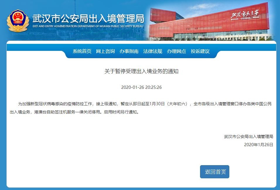 據《人民網》報導,武漢市公安局出入境管理局於昨(26)日晚間發布通知,「為加強新型冠狀病毒感染的疫情防控工作,接上級通知,暫定從即日起至1月30日(大年初六),全市各級出入境管理窗口停辦各類中國公民出入境業務,港澳台自助簽注機服務一律關閉停用,啟用時間另行通知。」